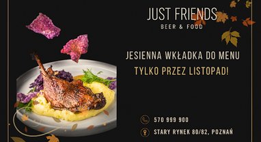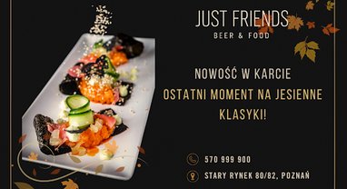 Restauracja "Just Friends" to wyjątkowe miejsce usytuowane na malowniczym Starym Rynku w samym sercu Poznania. To niezwykła przestrzeń, gdzie kulinaria spotykają się z wyjątkowym światem drinków, tworząc niezapomniane doświadczenie dla zmysłów. Menu restauracji to podróż po autentycznych smakach i aromatach regionu, przy jednoczesnym szacunku dla tradycji, która definiuje polską kuchnię. Potrawy przygotowywane są ze świeżych, lokalnych składników. Unikalnym elementem są drinki w nietypowych rozmiarach - giga kieliszki to idealny pomysł do podzielenia się w gronie przyjaciół. To najlepsze miejsce na celebrację chwil w towarzystwie bliskich przyjaciół i rodziny. Najlepsze na celebrację przyjaźni!